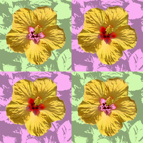 Hibiskusblüten x4 mit Hibiskusblüten hat Warhol viele Bild-Experimente gemacht und viele Bild-Varianten erstellt. Diese Hibiskusblüten sind allerdings aus einem eigenen Foto entwickelt.