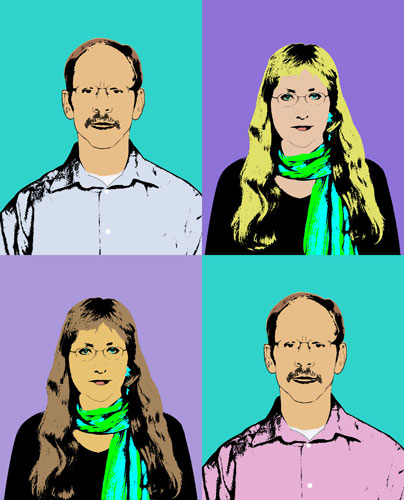 Partner und Partnerin im Viererkopfportrait auf türkis und violett Farbvariationen: Partner: Hemd: h'blau und rosa. Hintergrund: immer türkis.