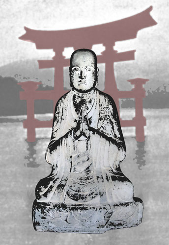 vor den schwimmenden Torii der Insel Miyajima positioniert. Die