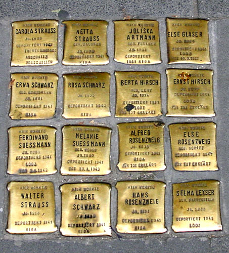 Wohnorten verankert er Stolpersteine aus Messing mit Namen und Vernichtungsort