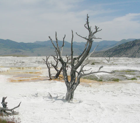 Nationalpark, Sinterterrassen (Salz) mit abgestorbenem, verkrustetem