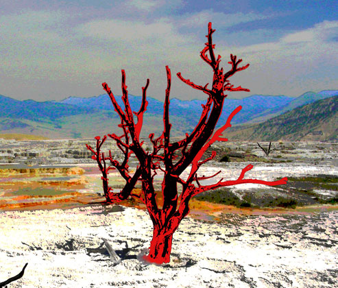 Baum wurde in Rot getaucht und dominiert das bizarre Bild.